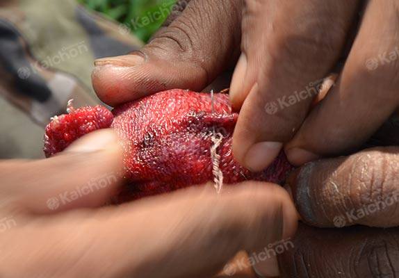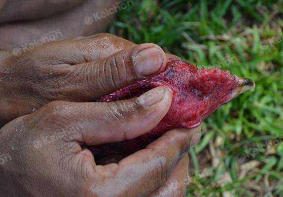 หลังจากนั้นใช้มือรีดเลือดที่คั่งอยู่ข้างในออกให้หมด
