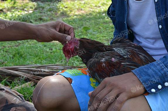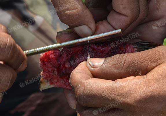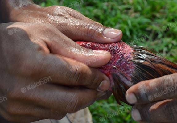 อุปกรณ์พร้อมแล้วก็เริ่มกันเลยครับ ทำความสะอาดบริเวณที่จะไขหัวไก่ชนให้เรียบร้อย ล้างด้วยน้ำสะอาดแล้วใช้ผ้าเช็ดให้แห้งเพื่อง่ายสำหรับการทำแผล แล้วใช้เชือกร้อยเข็มจิ่มไปที่บริเวณเลือดคั่งเพื่อทำการเปิดแผลเอาเลือดที่คั่งออก จากนั้นใช้มีดโกนผ่าเปิดแผล (ตามรูป) อย่าเปิดแผลให้กว้าง