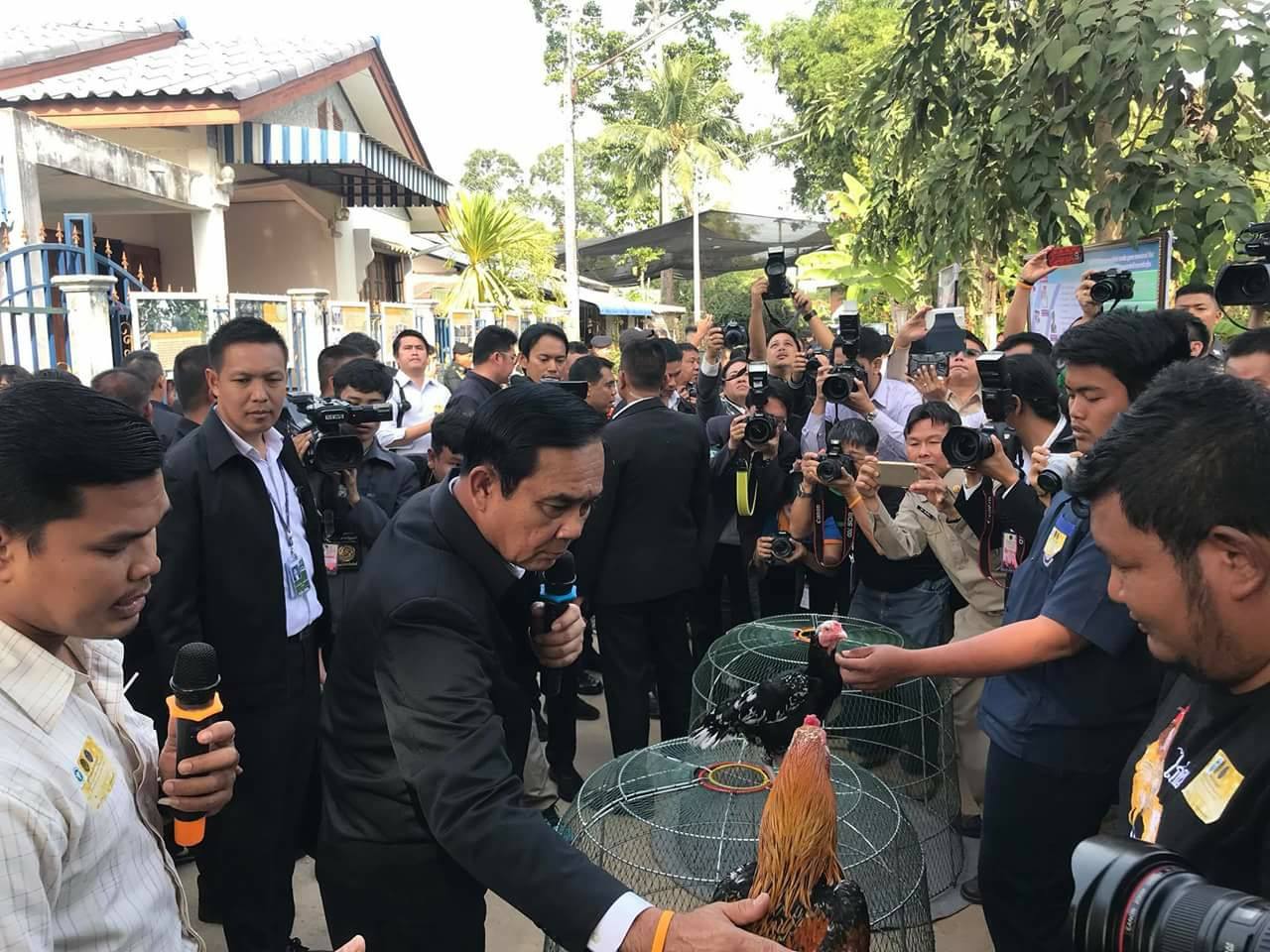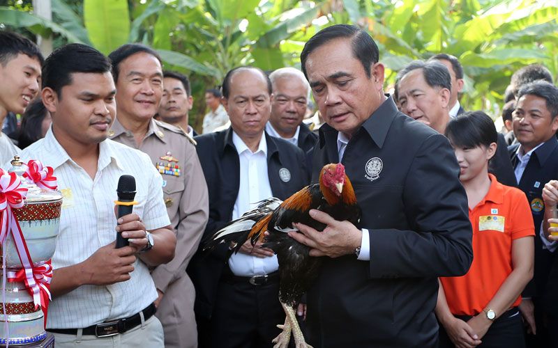 และจากนั้นนายกรัฐมนตรี ได้เยี่ยมชมไก่ชน สายพันธ์พื้นเมืองของจังหวัดพิษณุโลก หรือไก่ชนสมเด็จพระนเรศวร คือ “ไก่เหลืองหางขาว” ซึ่งเพิ่งได้รับรางวัลมา พร้อมลองอุ้มไก่ชนชื่อ “เทพประทานพร” และยังให้ความสนใจกับไก่ชนเหลืองหางข่าวพันธุ์วชื่อ ‘เจ้ามารวย’ ซึ่งมีราคากว่า 100,000 บาท เนื่องจากมีคุณลักษณะสมบูรณ์แบบไหล่กว้างบึกบึน แข้งมังกร ปัจจุบันไก่พันธุ์เหลืองหางขาวได้รับความสนใจจากชาวต่างประเทศมาขอซื้อลูกไก่ไปเลี้ยงจำนวนมากทั้งมาเลเซีย อินโดนีเซีย ลาว รวมทั้งบรูไน โดยนายกรัฐมนตรีได้พูดกับไก่ชนเทพประกายทอง พร้อมเกาคอว่า “ไม่ต้องกลัว คสช. นะ คสช. ไม่ดุ”