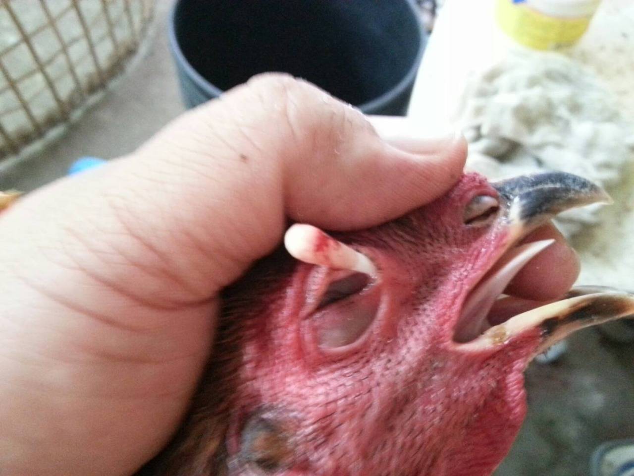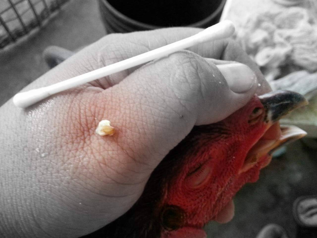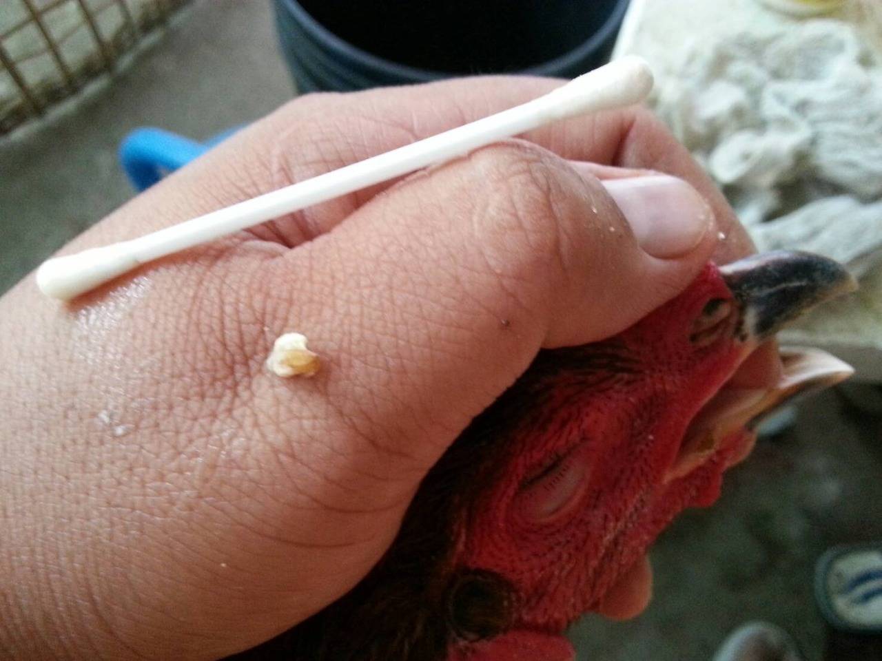 ใช้ก้านสำลี เช็ดเพด้านเพื่อนำเม็ดข้าวออก และทำความสะอาดบริเวณช่องปากของไก่