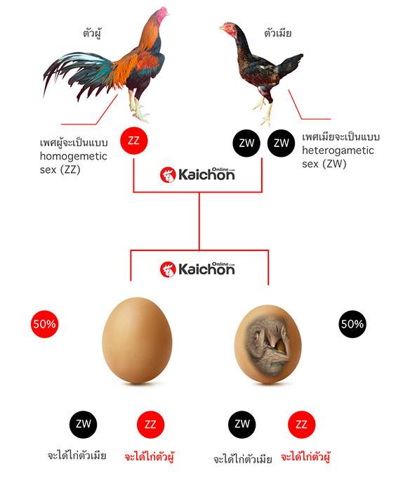 วันนี้ไก่ชนออนไลน์จึงอยากจะมาขอขยายความทำความเข้าใจ ไข่ข้อกระจ่างกันอีกสักหน่อย เพื่อจะได้เข้าใจตรงกันตามหลักวิชาการ การแยกเพศในสัตว์ปีกนั้นจะขึ้นอยู่กับไก่ชนตัวเมียเป็นหลักครับ เอาง่ายๆ คือไก่ชนเพศเมียจะมีโครโมโซมเพศเป็น ZW ส่วนไก่ชนตัวผู้จะมีโครโมโซมเพศเป็น ZZ โดยที่ไก่ชนเพศเมียนั้นจะสร้างไข่ได้ 2 ชนิด ชนิดหนึ่งมีโครโมโซม Z อีกชนิดหนึ่งมีโครโมโซม W ส่วนไก่เพศผู้จะสร้างสเปิร์มที่มีโครโมโซม Z เพียงอย่างเดียว ดังนั้น เมื่อสเปิร์มที่ผสมกับไข่ใบที่มี โครโมโซม Z (ZZ) ผลที่ออกมาจะได้ไก่ตัวผู้ แต่ถ้าสเปิร์มไปผสมกับไข่ใบทีมีโครโมโซม W (ZW) ก็ได้เป็นไก่เพศเมียครับ ฉะนั้นโอการที่บอกได้ว่าอันไหนคือไก่ตัวผู้ ไข่ใบไหนคือไก่ตัวเมีย จึงตอบได้ยากมาก เพราะขึ้นอยู่กับหลายองค์ประกอบของพ่อไก่และแม่ไก่ด้วย อากาศ อาหาร หรือความแข็งแรงของพ่อแม่ไก่ก็มีผล ดังนั้นจากคำถามที่เกรินไว้ตอนต้น ไก่ชนออนไลน์จึงขอสรุปว่าไม่สามารถระบุเพศของไก่จากลักษณะไข่ได้ 100% ครับ แต่ถ้าเป็นหลังจากไก่ฟักไปแล้วไม่เกิน 48 ชั่วโมง ก็พอจะมีวิธีดูได้ครับ