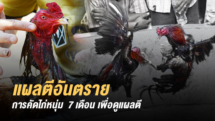การคัดไก่หนุ่ม 7 เดือน ดูลักษณะความพร้อม ขนปีก ขนสร้อย ขนหาง ไก่ที่นำมาตรวจเช็ค ต้องเป็นไก่อายุ 7 เดือนกว่า ดูชั้นเชิง ดูลูกตี ว่าตีแผลไหน ตีเจ็บ ตีเบา ตีด้วยก้อย ตีด้วยแข้ง หรือตีด้วย เดือย จากนั้นดูกริยาการแสดงออก ดูหัวจิตหัวใจ ว่าเป็นไก่นักสู้ หรือเป็นไก่ใจน้อย