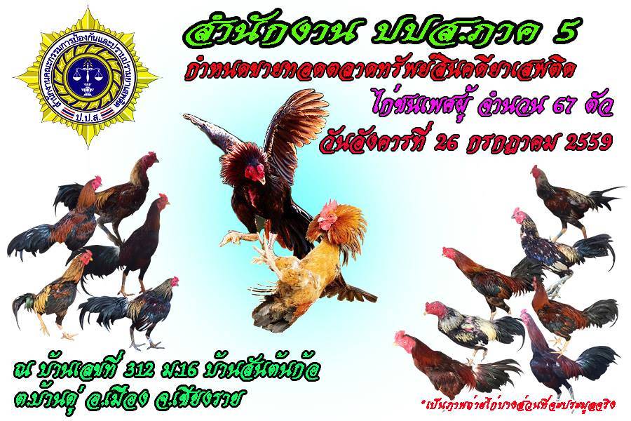 สำนักงาน ปปส.ภาค 5 กำหนดขายทอดตลาดทรัพย์สินคดียาเสพติด ครั้งที่ 8/2559 ประเภทไก่ชนเพศผู้ จำนวน 67 ตัว ตามคำสั่งเลขาธิการ ป.ป.ส. ที่ 4094/2559 ลงวันที่ 15 กรกฎาคม 2559 โดยจะทำการขายทอดตลาด ในวันอังคารที่ 26 กรกฎาคม 2559 ตั้งแต่เวลา 13.00 น. เป็นต้นไป ณ บ้านเลขที่ 312 หมู่ 16 บ้านสันต้นก้อ ตำบลบ้านดู่ อำเภอเมืองเชียงราย จังหวัดเชียงราย