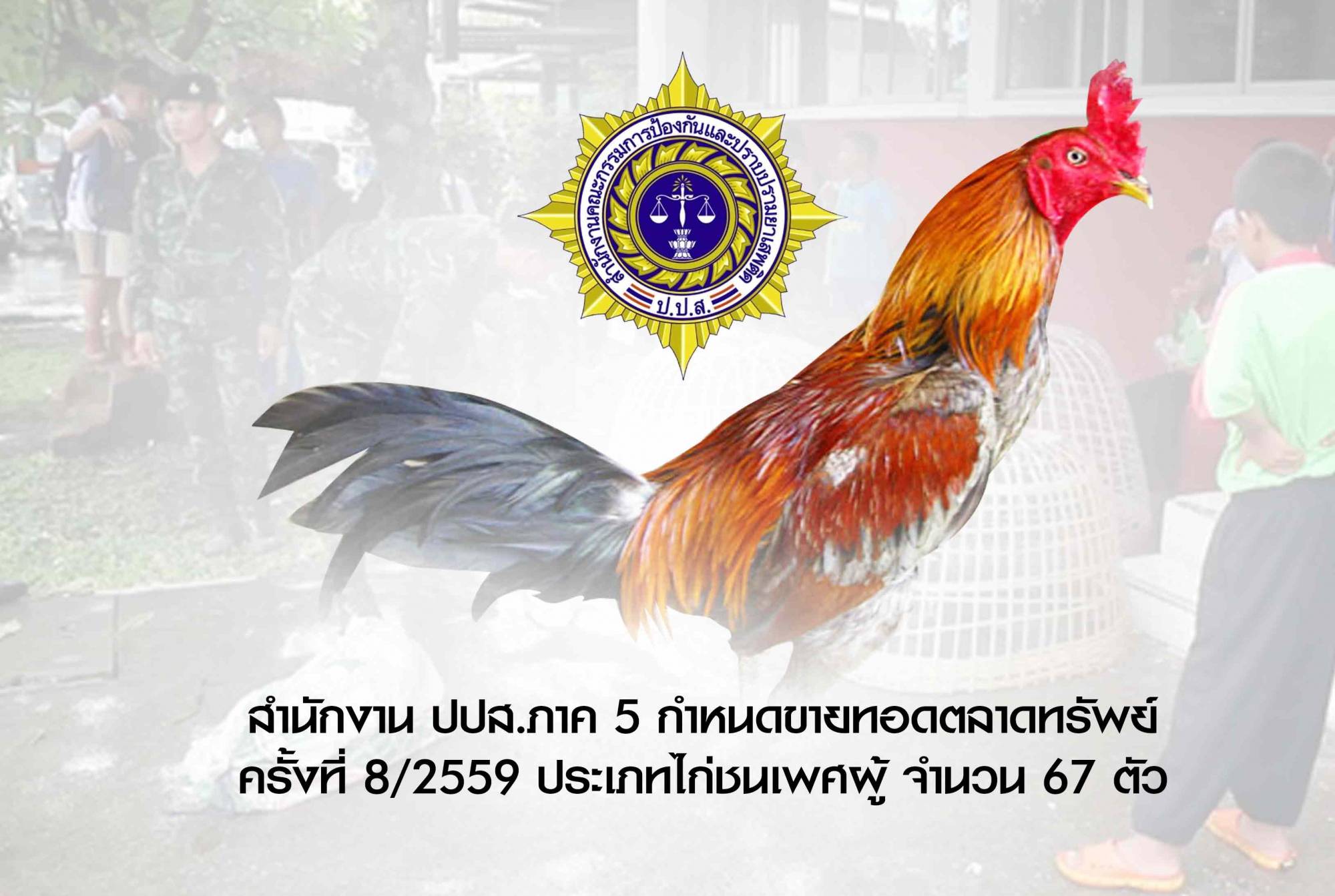 สำนักงาน ปปส.ภาค 5 กำหนดขายทอดตลาดทรัพย์สินคดียาเสพติด ครั้งที่ 8/2559 ประเภทไก่ชนเพศผู้ จำนวน 67 ตัว