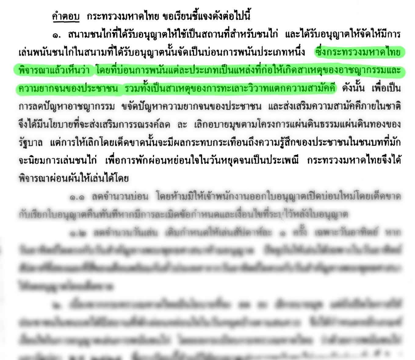 1.สนามชนไก่ที่ได้รับอนุญาตให้ใช้เป็นสถานที่สำหรับชนไก่ และได้รับอนุญาติให้จัดให้มีการเล่นพนันชนไก่ในสนามที่ได้รับอนุญาตนั้นจัดเป็นบ่อนการพนันประเภทหนึ่ว ซึ่งกระทรวงมหาดไทยพิจารณาแล้วเห็นว่า โดยบ่อนการพนันแต่ละประเภทเป็นแหล่งที่ก่อให้เกิดสาเหตุของอาชญากรรมและความยากจนของประชาชน รวมทั้งเป็นสาเหตุของการทะเลาะวิวาทแตกความสามัคคี ดังนั้น เพื่อเป็นการลดปัญหาอาชญากรรม ขจัดปัญหาความยากจนของประชาชน และส่งเสริมความสามัคคีภายในชาติ จึงมีนโยบายที่จะส่งเสริมการรณรงค์ลด ละ เลิกอบายมุขตามโครงการแผ่นดินธรรมแผ่นดินทองของรัฐบาล แต่การให้เลิกโดยเด็ดขาดนั้นจะมีผลกระทบกระเทือนถึงความรู้สึกของประชาชนในชนบทที่มักจะนิยมการเล่นการชนไก่ เพื่อการพักผ่อนหย่อนใจในวันหยุดจนเป็นประเพณี กระทรวงมหาดไทยจึงได้พิจารณาผ่อนผันให้เล่นได้โดย ลดจำนวนบ่อน, ลดจำนวนวันเล่น (ตามเอกสาร)
