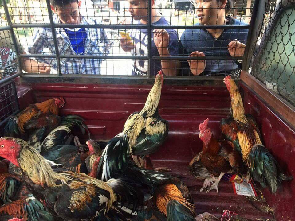 สภาพไก่ที่ถูกเจ้าหน้าที่นำไปขังไว้รวมกันบนรถชนกันเสียหาย : ไก่ชนออนไลน์