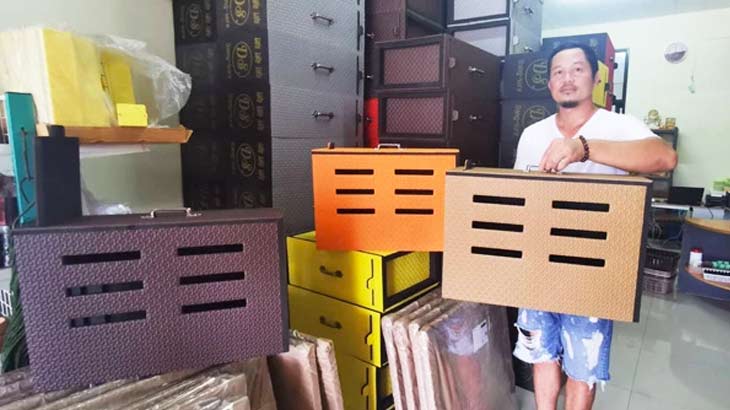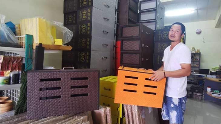 ส่วนกล่องไก่ชนมีให้เลือกหลายสี ได้แก่ สีดำ เทา น้ำเงิน น้ำตาล ชมพู เหลือง แดง และสีส้ม ขายกล่องละ 450 บาท กล่องใส่ไก่แจ้กล่องละ 800 บาท กล่องสนามใส่ยา 300 บาท ถาดใส่ยา 160 บาท เก้าอี้สนาม 160 บาท ปัจจุบันต้องจ้างโรงงานผลิตเพราะทำด้วยมือไม่ทันต่อความต้องการของลูกค้า เพราะมีออเดอร์ส่งขายให้ร้านที่เป็นเครือข่ายในไทย รวมถึงต่างประเทศ เช่น สปป.ลาว มาเลเซีย และอินโดนีเซีย รวมถึงขายผ่านออนไลน์ทุกวัน วันละไม่ต่ำกว่า 300 กล่อง
