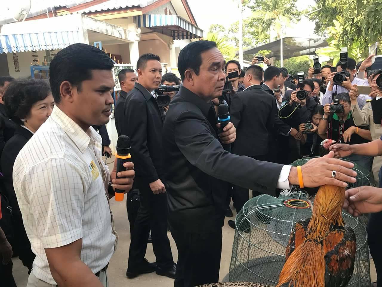 และจากนั้นนายกรัฐมนตรี ได้เยี่ยมชมไก่ชน สายพันธ์พื้นเมืองของจังหวัดพิษณุโลก หรือไก่ชนสมเด็จพระนเรศวร คือ “ไก่เหลืองหางขาว” ซึ่งเพิ่งได้รับรางวัลมา พร้อมลองอุ้มไก่ชนชื่อ “เทพประทานพร” และยังให้ความสนใจกับไก่ชนเหลืองหางข่าวพันธุ์วชื่อ ‘เจ้ามารวย’ ซึ่งมีราคากว่า 100,000 บาท เนื่องจากมีคุณลักษณะสมบูรณ์แบบไหล่กว้างบึกบึน แข้งมังกร ปัจจุบันไก่พันธุ์เหลืองหางขาวได้รับความสนใจจากชาวต่างประเทศมาขอซื้อลูกไก่ไปเลี้ยงจำนวนมากทั้งมาเลเซีย อินโดนีเซีย ลาว รวมทั้งบรูไน โดยนายกรัฐมนตรีได้พูดกับไก่ชนเทพประกายทอง พร้อมเกาคอว่า “ไม่ต้องกลัว คสช. นะ คสช. ไม่ดุ”